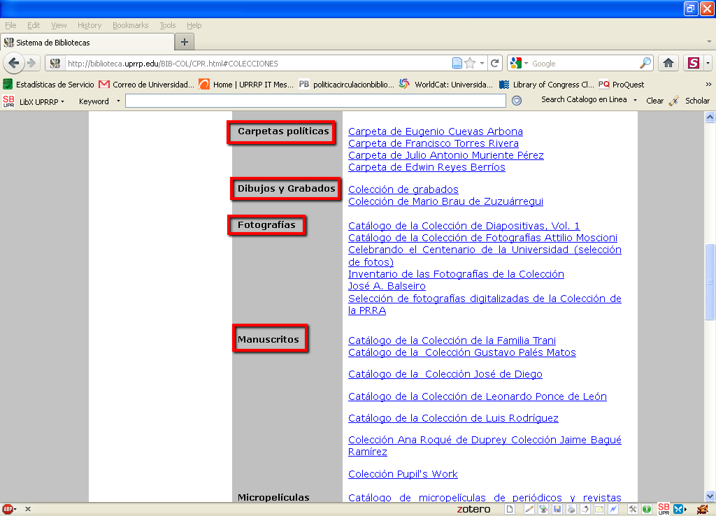 Gran parte de su acervo puede localizarse a través del Catálogo en Línea del SB. Otros recursos, tales como las Carpetas Políticas, los Dibujos y Grabados, las Fotografías y los Manuscritos han sido analizados individualmente y sus contenidos pueden localizarse mediante índices ubicados en la sección de Página del SB dedicada a la Colección Puertorriqueña.
