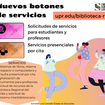 El Sistema de Bibliotecas de la Universidad de Puerto Rico, Recinto de Río Piedras ha seguido ofreciendo servicios bibliotecarios durante el periodo de la cuarentena causada por el COVID 19. Nuestros servicios de consulta a distancia mediante el chat, la referencia virtual, correos electrónicos y a través de las redes sociales, han sido de gran … More Nuevos botones de #servicios en la página del Sistema de Bibliotecas