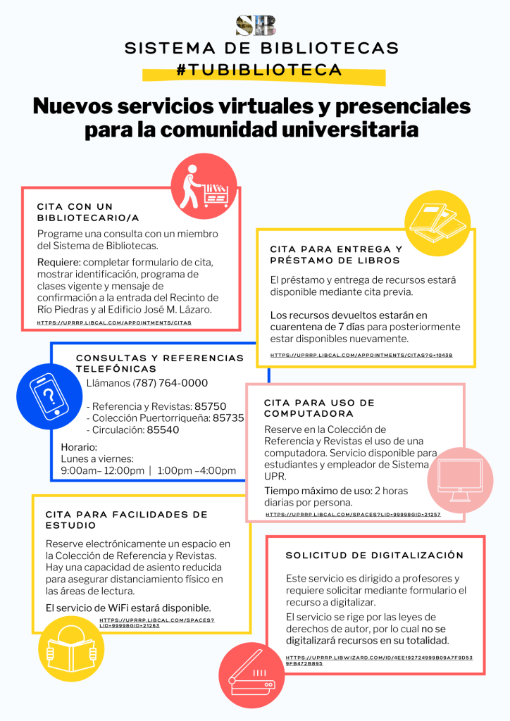 Todos estos servicios están disponibles ya. Para los servicios por cita puedes acceder las solicitudes desde la Página del Sistema de Bibliotecas. Para entrar al Recinto de Río Piedras y al Edificio José M. Lázaro (puerta posterior del edificio) debe mostrar el mensaje de correo electrónico confirmando su cita. El oficial de seguridad, también te pedirá tu identificación y el programa de clases para el semestre de agosto a diciembre 2020. Por tu seguridad y la de los demás, recuerda llevar puesta una mascarilla en todo momento.