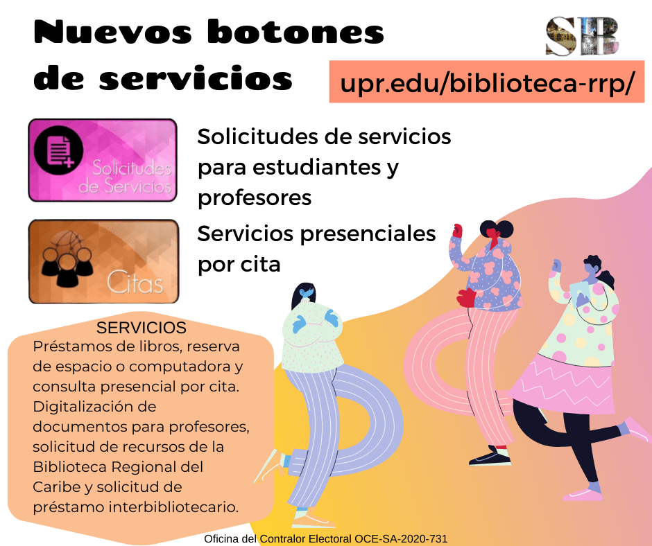 Otro de los ofrecimientos nuevos son los servicios presenciales por cita. Estos servicios son: la consulta presencial, la reserva de una computadora para utilizar por dos horas, la reserva de un espacio de estudio individual en la Colección de Referencia y Revistas y el préstamo y devolución de libros. Se han creado formularios para cada uno de estos servicios y los mismos están disponibles en la página del Sistema de Bibliotecas. Al llenar el formulario podrás hacer una cita para obtener el servicio que intereses.