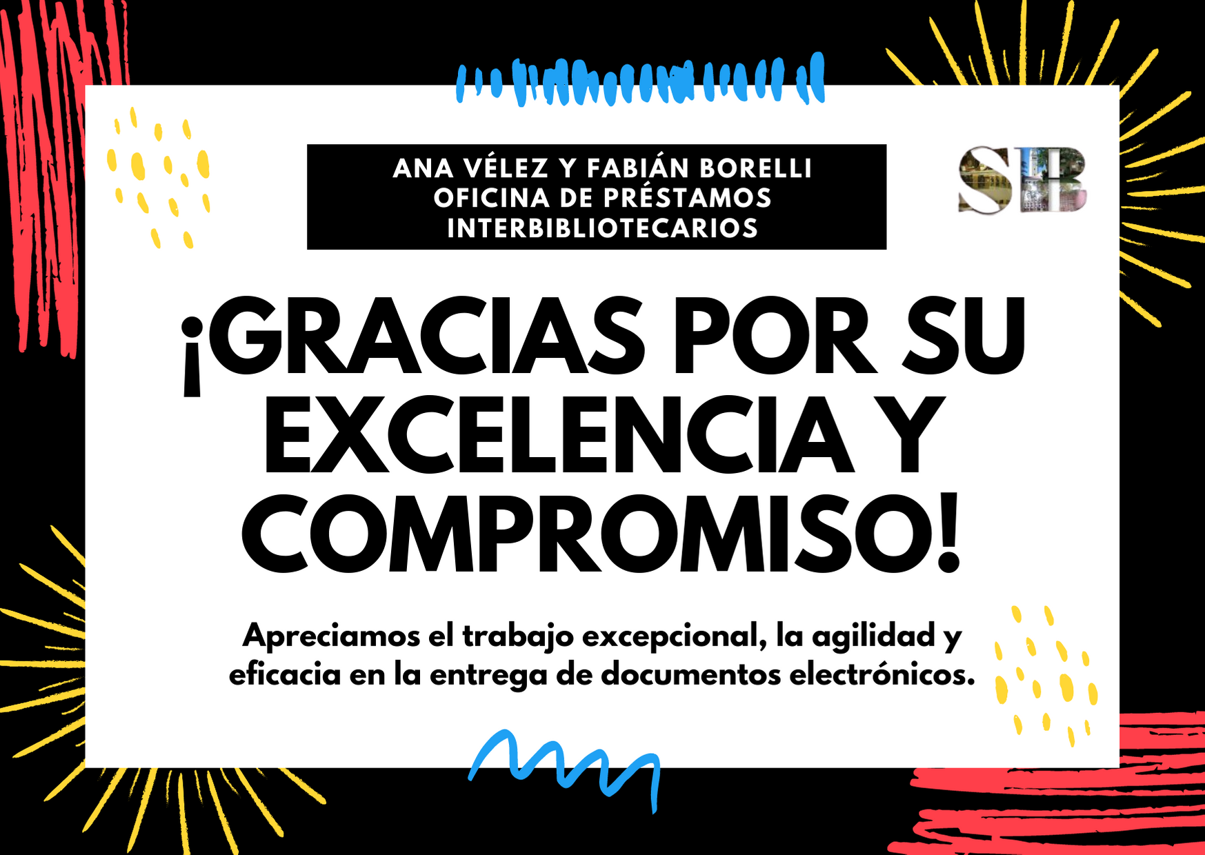 Nuestro agradecimiento a Ana Vélez Jiménez y a Fabián Borelli Cruz por su excelencia y compromiso y por poner el nombre de la Oficina de Préstamos Interbibliotecarios y el de la Universidad de Puerto Rico en alto. ¡Enhorabuena!