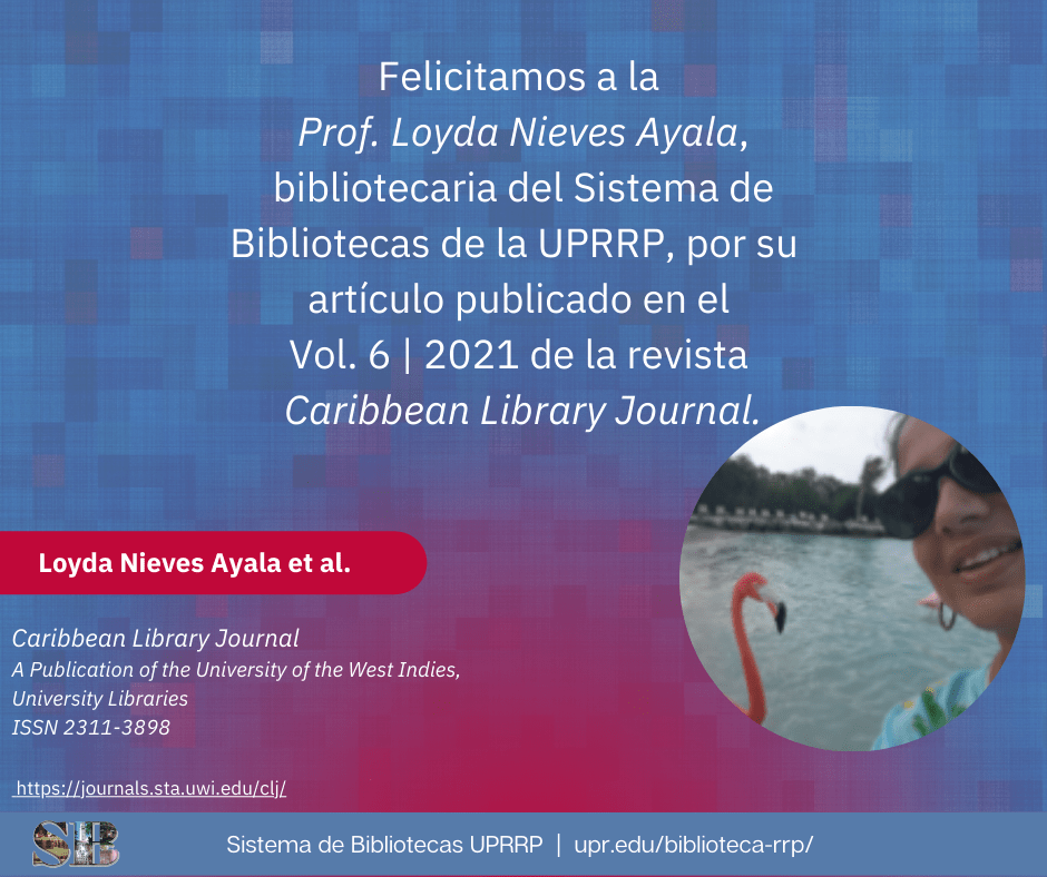 El Sistema de Bibliotecas felicita a la profesora Loyda Nieves Ayala, Bibliotecaria de Administración de Empresas del Sistema de Bibliotecas de la Universidad de Puerto Rico en Río Piedras, por la publicación de su artículo en la revista Caribbean Library Journal.
