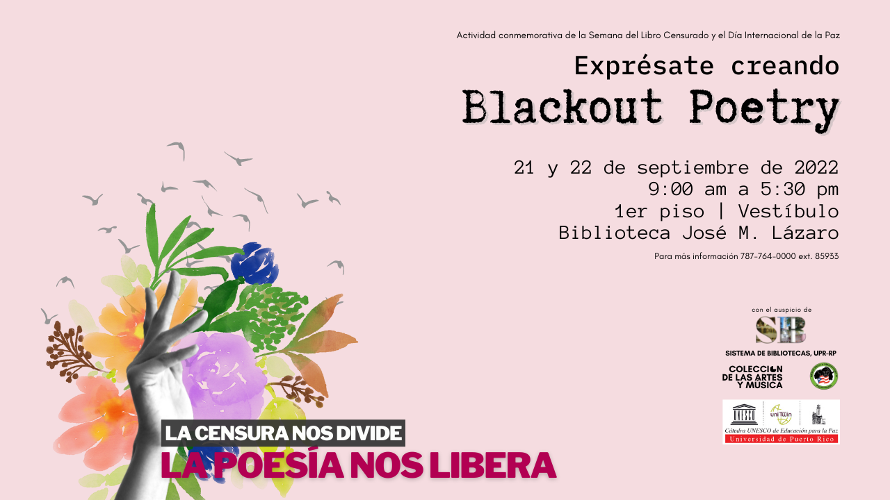 El Sistema de Bibliotecas de la Universidad de Puerto Rico, Recinto de Río Piedras, se une a la celebración con una actividad autodirigida titulada La censura nos divide / La poesía nos libera: Blackout Poetry. Esta actividad creativa consiste en tomar una hoja de papel ya escrita y dejar visibles o resaltar solo las palabras que formen un nuevo poema. Cada participante podrá seleccionar diferentes materiales para su obra creativa y el idioma de su preferencia entre español, inglés y francés. Esta actividad se llevará a cabo el 21 y 22 de septiembre de 2022 en el vestíbulo del Edificio José M. Lázaro entre 9:00 am a 5:30 pm.