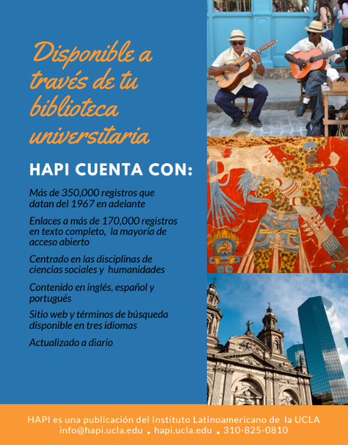 ¿Buscas artículos académicos sobre Latinoamérica, el Caribe y comunidades latinas en los Estados Unidos? Publicado el 12 septiembre 202213 septiembre 2022 por SisBibUPRRP Utiliza la base de datos Hispanic American Periodicals Index- HAPI suscrita por el Sistema de Bibliotecas. Tu voto:Comparte esto: Compartir en LinkedIn (Se abre en una ventana nueva) LinkedIn Compartir en Telegram (Se abre en una ventana nueva) Telegram Compartir en WhatsApp (Se abre en una ventana nueva) WhatsApp Enviar un enlace a un amigo por correo electrónico (Se abre en una ventana nueva) Correo electrónico Comparte en Facebook (Se abre en una ventana nueva) Facebook Compartir en X (Se abre en una ventana nueva) X Me gusta Cargando...