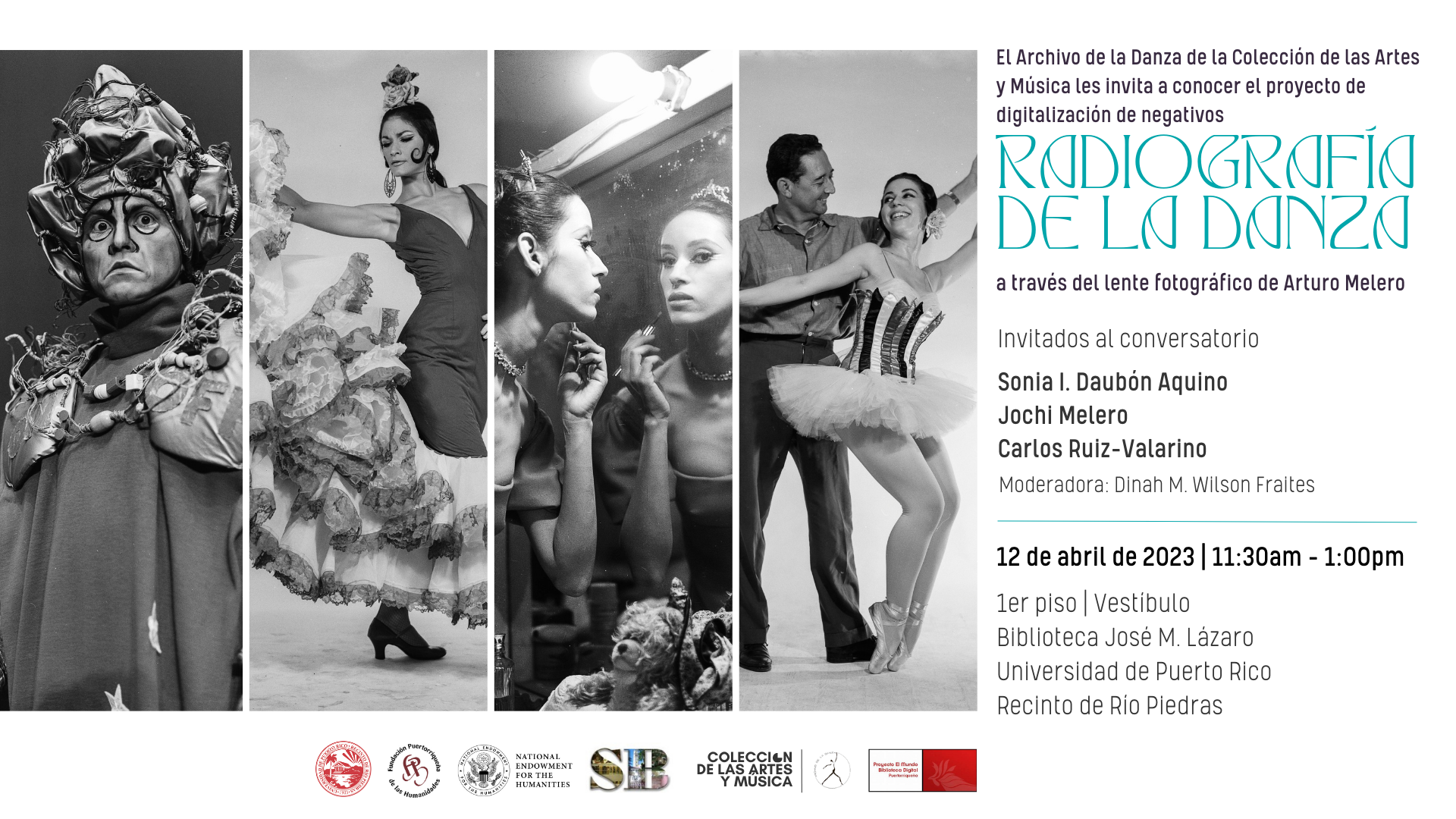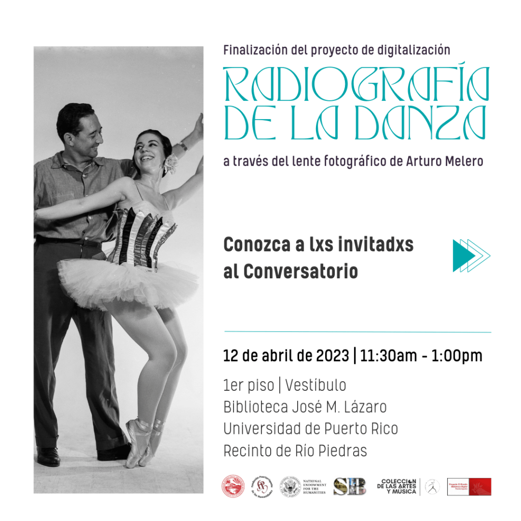 La Colección de las Artes y Música del Sistema de Bibliotecas de la Universidad de Puerto Rico, Recinto de Río Piedras les invita al conversatorio Radiografía de la Danza: a través del lente fotográfico de Arturo Melero a celebrarse el miércoles 12 de abril de 2023 en el Vestíbulo de la Biblioteca José M. Lázaro.