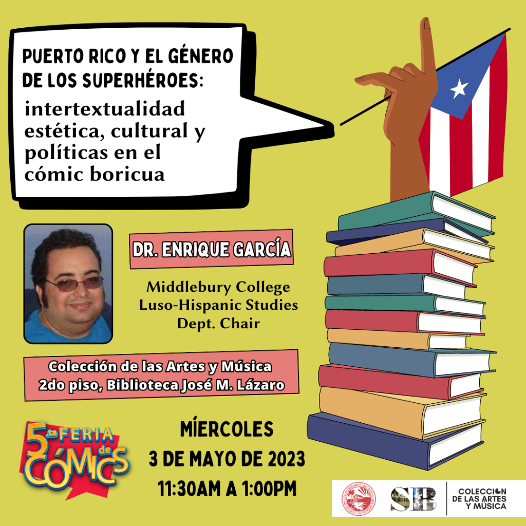 Como parte de la oferta de la 5ta. Feria de Cómics del Sistema de Bibliotecas, la Colección de las Artes y Música les invita a su próxima actividad Puerto Rico y el género de los superhéroes: intertextualidad estética, cultural y políticas en el cómic boricua en las inmediaciones de la Colección, en el 2do piso de la Biblioteca José M. Lázaro.