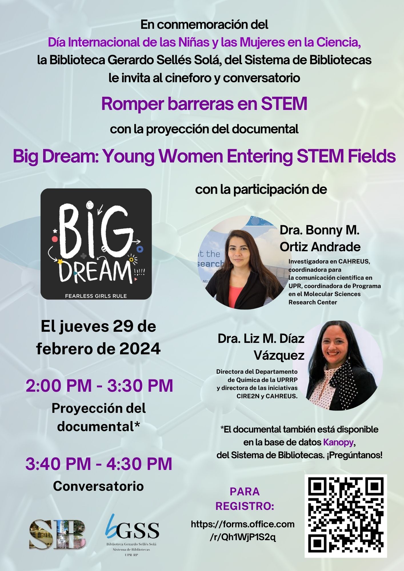 Para explorar preguntas como esta, el 29 de febrero de 2024 se realizó Romper barreras en STEM, un cineforo y conversatorio en la Biblioteca de Educación Gerardo Sellés Solá, del Sistema de Bibliotecas, con motivo del Día Internacional de la Mujer y la Niña en las Ciencias. Este evento contó con la participación de las Dras. Liz M. Díaz Vázquez y Bonny M. Ortiz Andrade, quienes conversaron sobre sus experiencias en la academia y sobre su labor en la educación en STEM de tanto niños y niñas, como mujeres y personas de género diverso.
