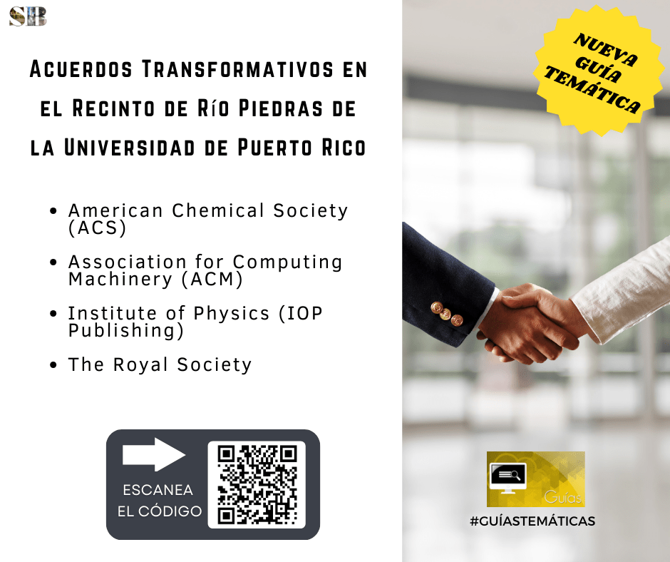 Actualmente el Recinto de Río Piedras tiene acuerdos transformativos o read and publish, gestionados por el Sistema de Bibliotecas, con las siguientes editoriales: