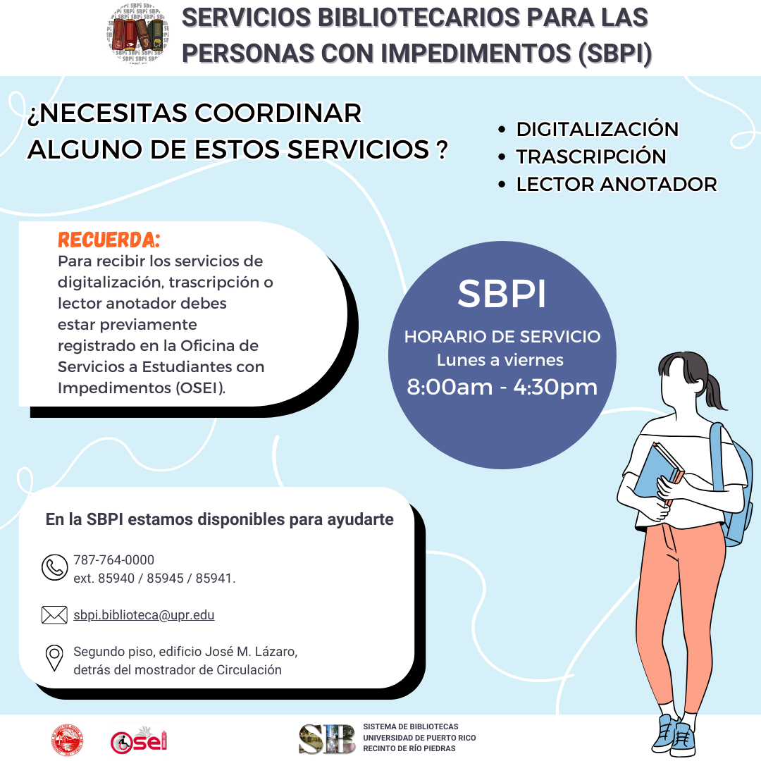 Nuestros servicios incluyen la digitalización y transcripción de documentos, lector anotador, préstamos de equipo de asistencia tecnológica, entre otros.