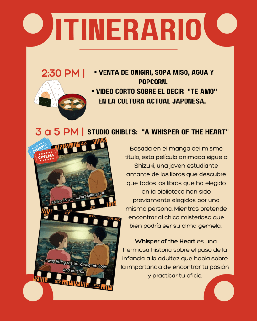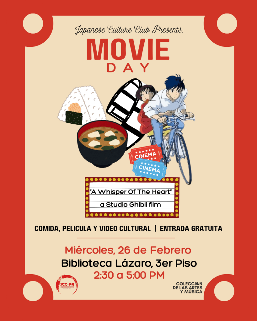 🎥 𝟯:𝟬𝟬 – 𝟱:𝟬𝟬 𝗣𝗠 – Proyección de Whisper of the Heart de Studio Ghibli. ¡Ven por la película, quédate por la cultura!