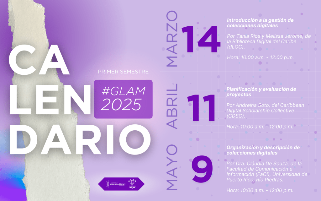 El proyecto GLAM DCM PR (Gestión de Colecciones Digitales GLAM) ha organizado un ciclo de talleres en línea y gratuitos para promover y apoyar el desarrollo profesional de los trabajadores de la memoria en instituciones GLAM, guiándolos en la creación y gestión de colecciones digitales.