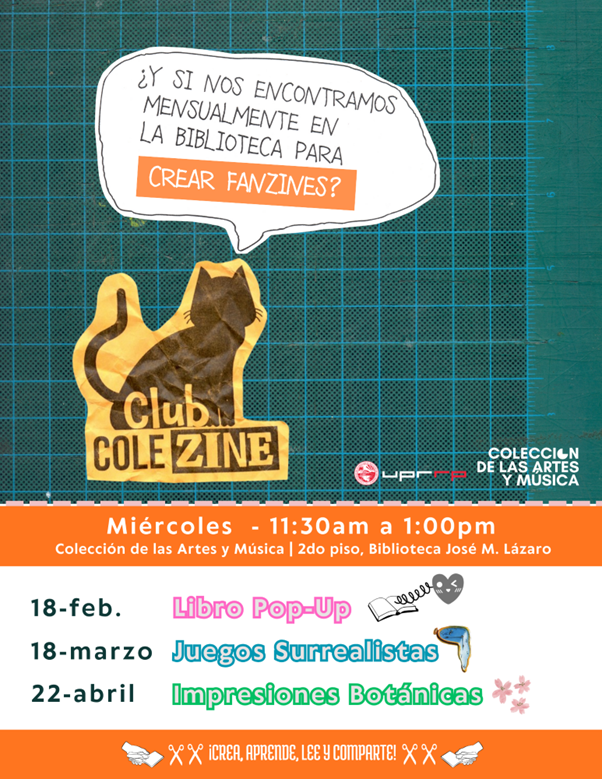 El Club ColeZine de la Colección de las Artes y Música vuelve este semestre con una nueva jornada de actividades diseñadas para fomentar la creación, lectura e intercambio de publicaciones alternativas popularmente conocidas como zines o fanzines en la Universidad de Puerto Rico, Recinto de Río Piedras.