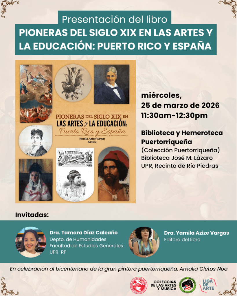 San Juan, Puerto Rico – La Colección de las Artes y Música y la Biblioteca y Hemeroteca Puertorriqueña de de la Universidad de Puerto Rico, Recinto de Río Piedras les invita a participar de la Presentación del libro: Pioneras del siglo XIX en las artes y la educación: Puerto Rico y España a celebrarse el 25 de marzo de 2026 en el segundo piso de la Biblioteca José M. Lázaro entre 11:30 am a 12:30 pm.