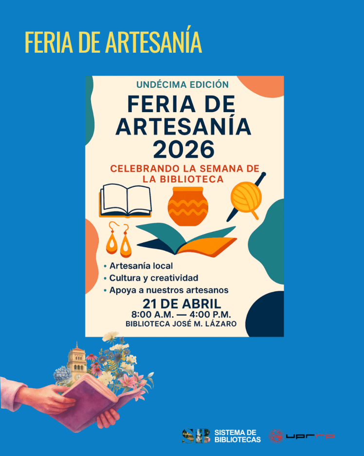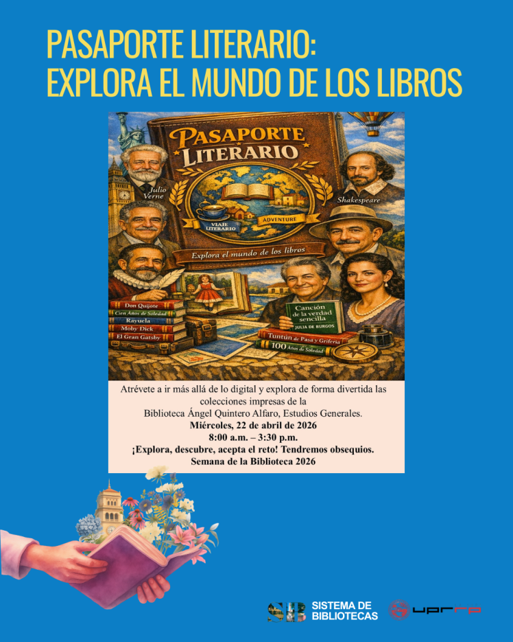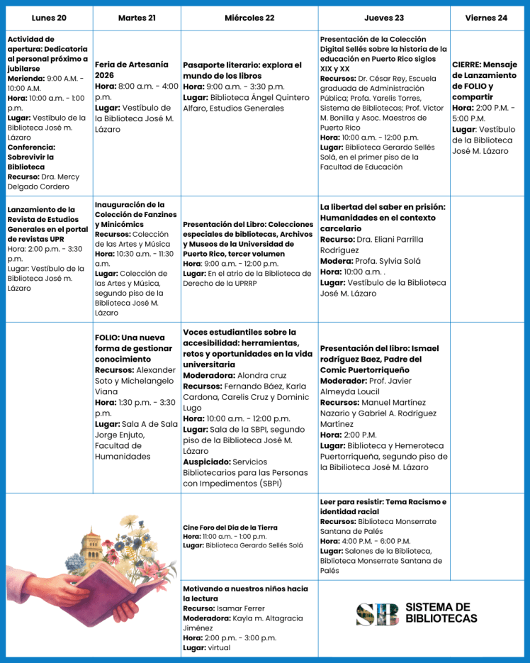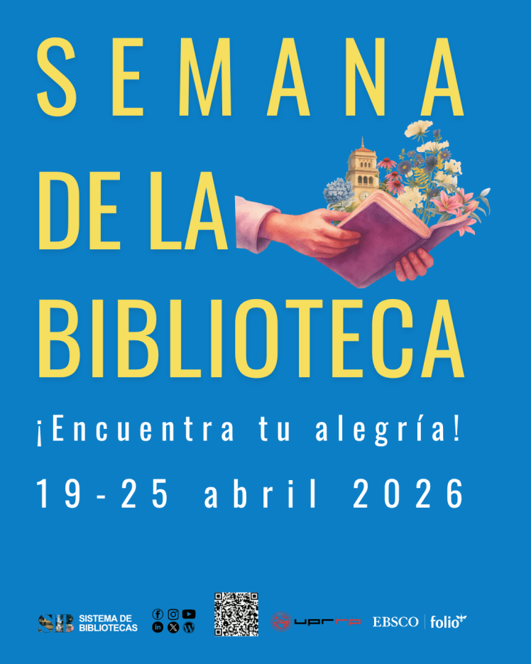 El Sistema de Bibliotecas de la Universidad de Puerto Rico se complace en presentar el programa de actividades en celebración de la Semana de la Biblioteca, que se llevará a cabo del 19 al 25 de abril de 2026.