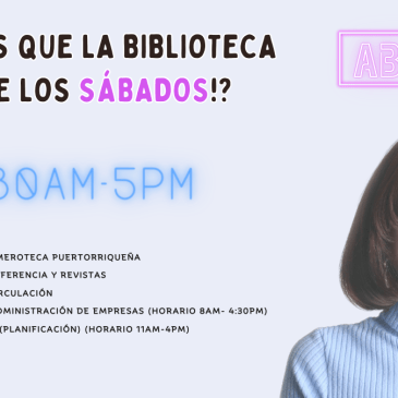 Abrimos los sábados en el horario de 8:30am a 5pm Las Bibliotecas y Colecciones que están abierta los sábados son: Para más horarios visita: https://uprrp.libcal.com/