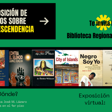 Ubicados en el 1er piso de la Biblioteca José M. Lázaro En la celebración de la afrodescendencia, la Biblioteca Regional del Caribe ha preparado una exposición en vitrina de libros sobre este tema. Éstos se encuentran físicamente en el 1er piso de la Biblioteca José M. Lázaro o puedes visitar la versión virtual escaneando el … More Ven a la exposición en vitrina de libros sobre afrodescendencia